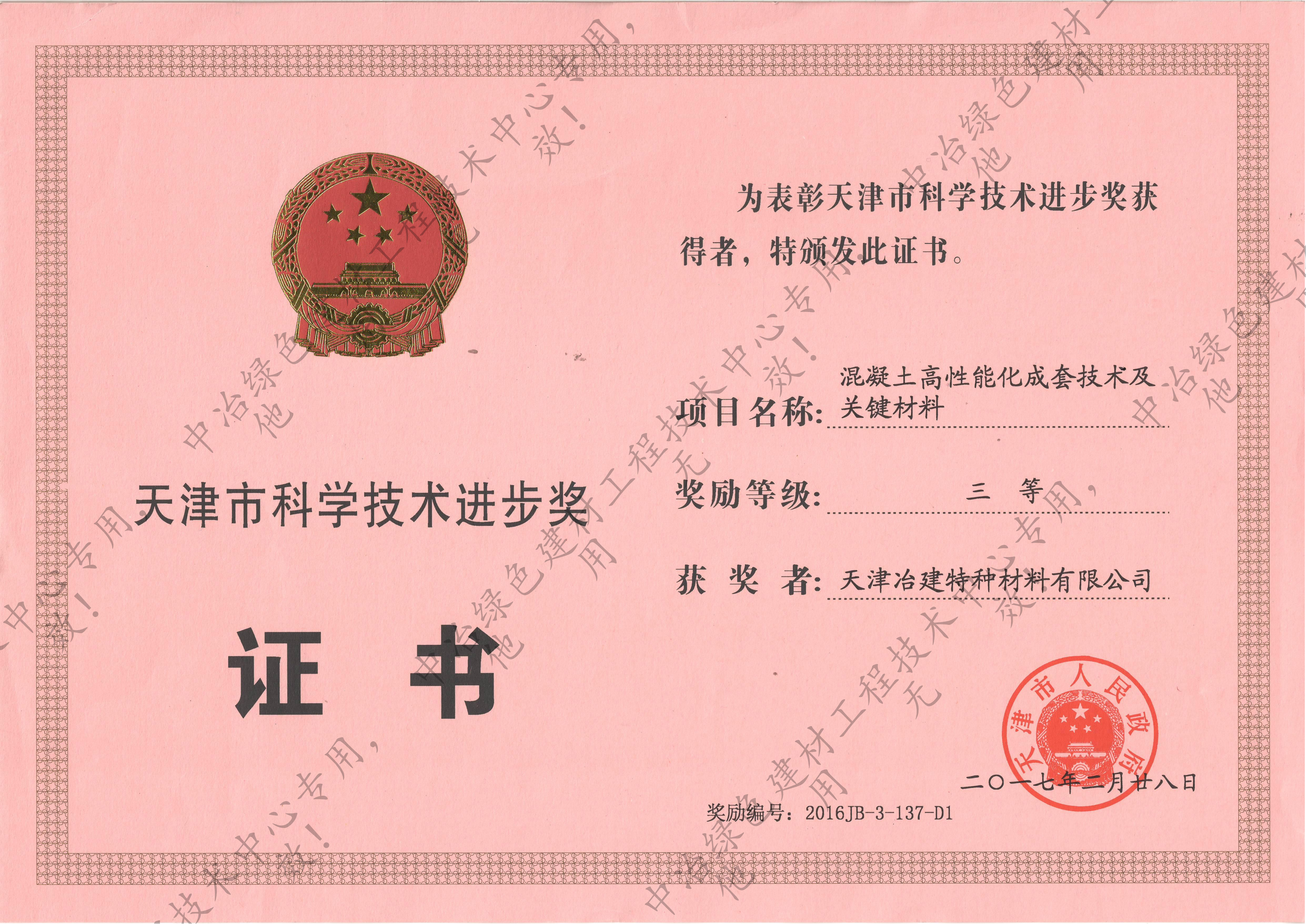 天津市科学技术进步奖(混凝土高性能化成套技术及关键材料)